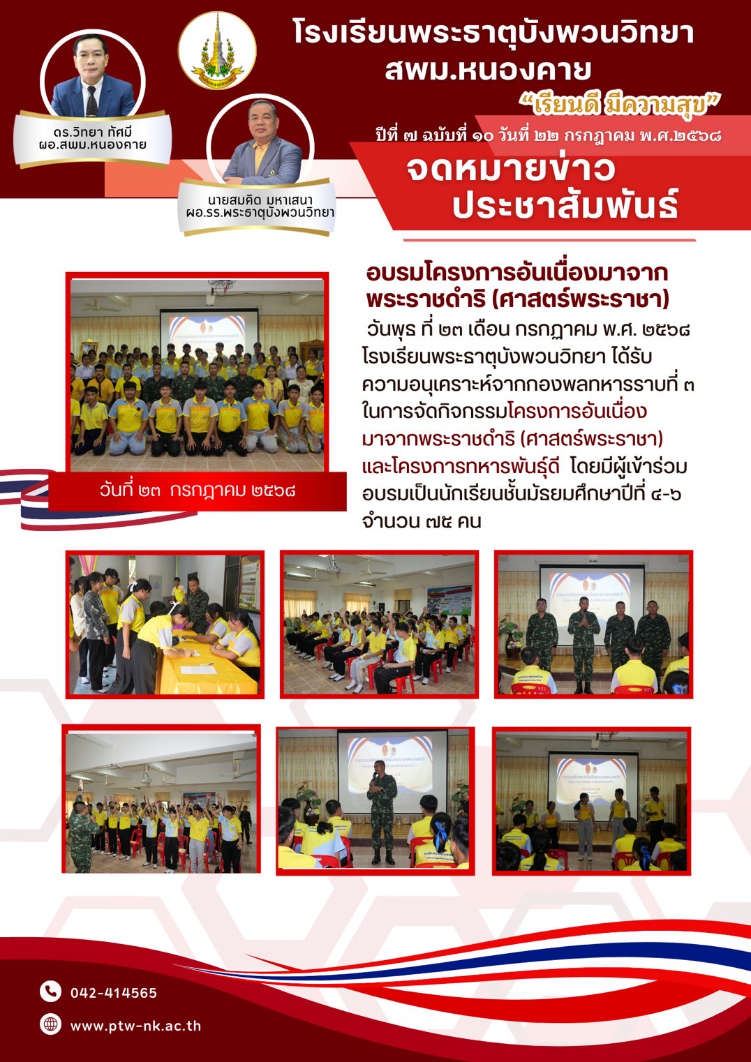 ในวันที่ 23 กรกฎาคม 2568 โรงเรียนพระธาตุบังพวนได้รับความอนุเคราะห์จากกองพลทหารราบที่ 3 ในการจัดกิจกรรมอบรมโครงการอันเนื่องมาจากพระราชดำริ(ศาสตร์พระราชา) และโครงการทหารพันธุ์ดี โดยมีผู้เข้าร่วมอบรม เป็นนักเรียนชั้น ม.4-6 จำนวน 75 คน